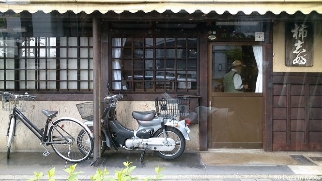 We stopped on our way to the temple at Kakishibu, a shop in Kyoto which sells mainly one thing: The liquid essence of dried and fermented unripe kaki fruits. It is used to dye clothes, wood and protect them against insects and water damage (to some degree). This essence is sold throughout the country, specialist garden shops as well as DIY and hardware stores. It is quite pricey. This small and unsuspicious shop is where they make the essence and run their business:
