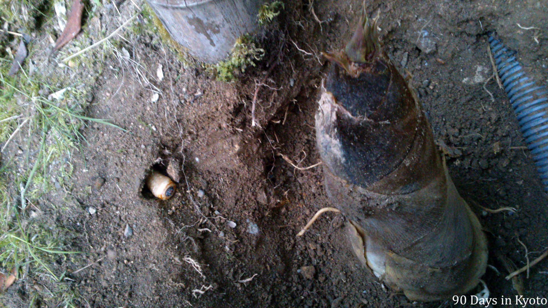 I was digging out a bamboo shoot (take-no-ko, 竹の子) this evening and woke up the larva of a rhinoceros beetle (kabuto-mushi, カブト虫). You have to know that they are big, really big. The diameter is probably wider than 1 centimeter. I was a little surprised when I saw it. Sazaki-kun told me that I shouldn’t touch it (as if I would do so), because if the larva is touched in this stage, the beetle will have a different shape later.