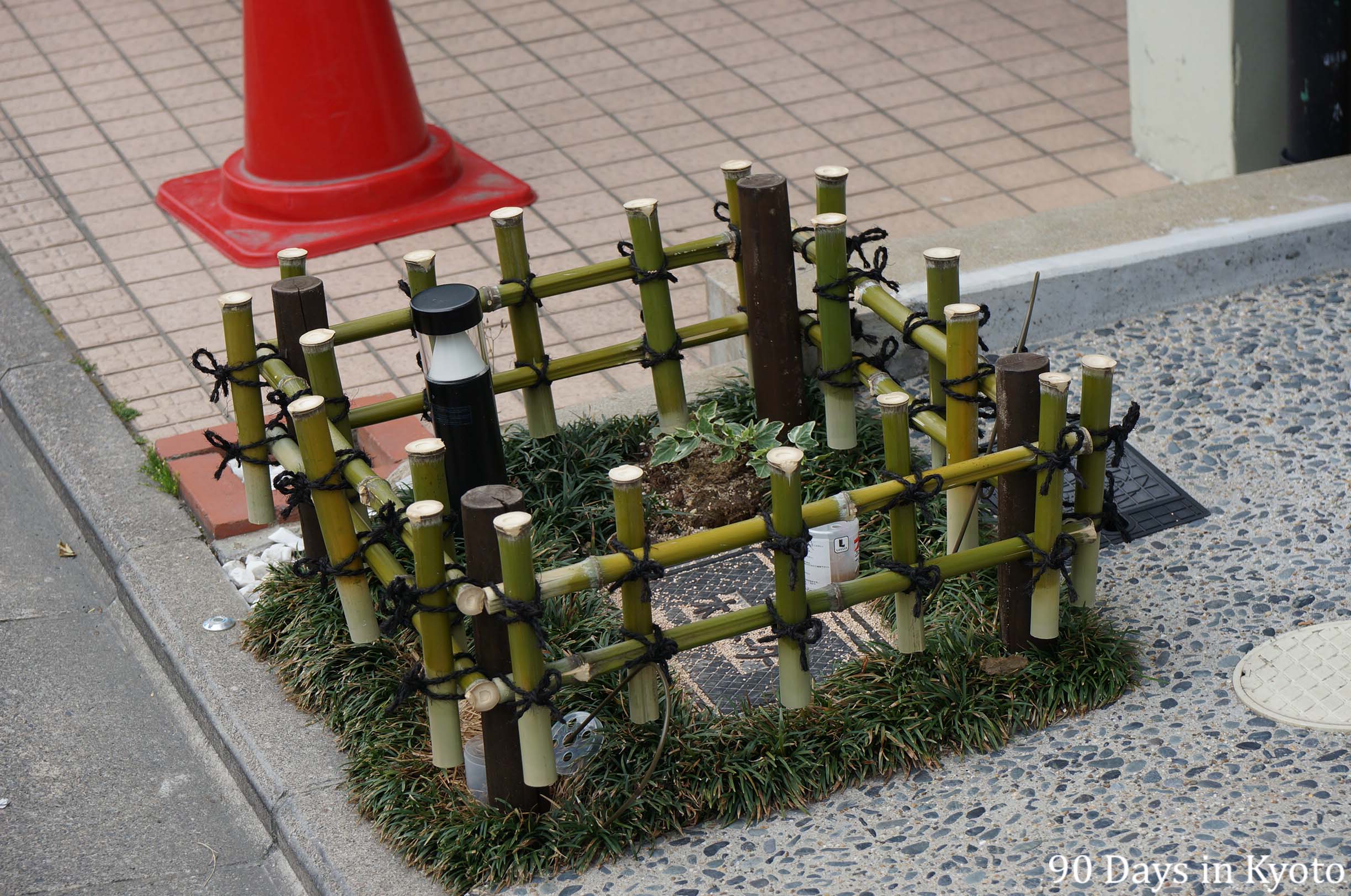 This is a miniature version of the popular Yotsume-gaki bamboo fence and it is used to mark a water faucet.
